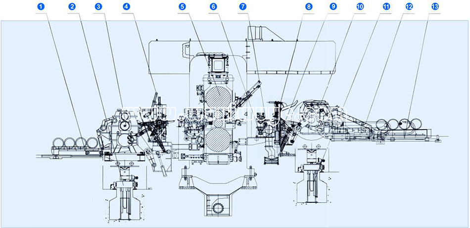![]() Description of machine1. Sleeve lead-out device 2. entry coil-transporting device 3. uncoiler 4. pinch roller 5. main mill 6. edge cutter 7. scrap transporting device 8. hydraulic shear 9. guiding device 10. coiler 11. exit coil transporting device 12. belt wrapper 13. sleeve guide-in deviceSpecifications description
